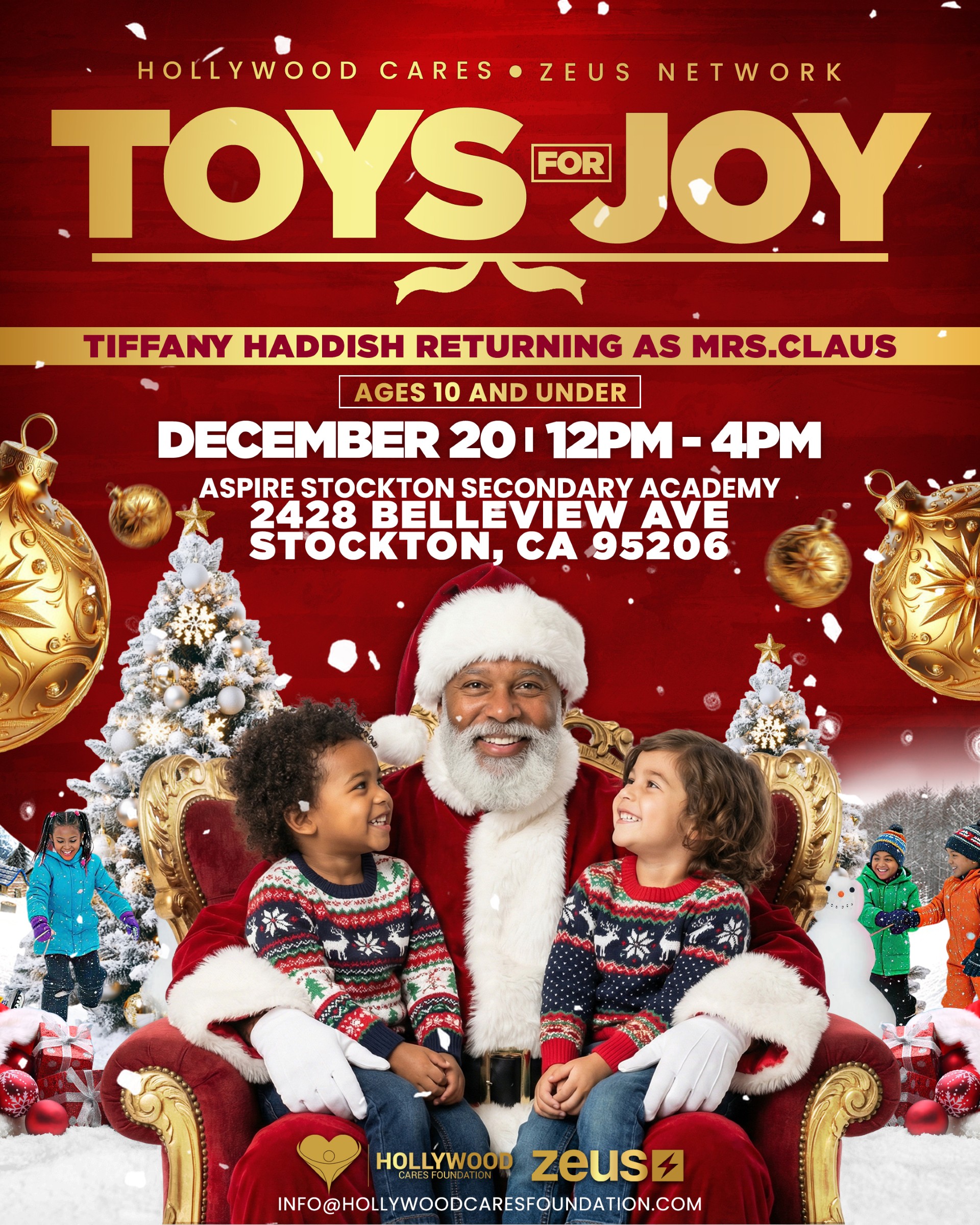 Join us at the Hollywood Cares Foundation Presents: 3rd Annual Toys for Joy Christmas Toy Giveaway event! The event will take place on Saturday, December 20th, from 12:00 PM - 4:00 PM PST - at Aspire Stockton Secondary Academy. Parents and guardians - bring your children and loved ones - ages 10 and under will receive a free toy! There will also be free haircuts, hot meals, gaming, community resources, music and more.