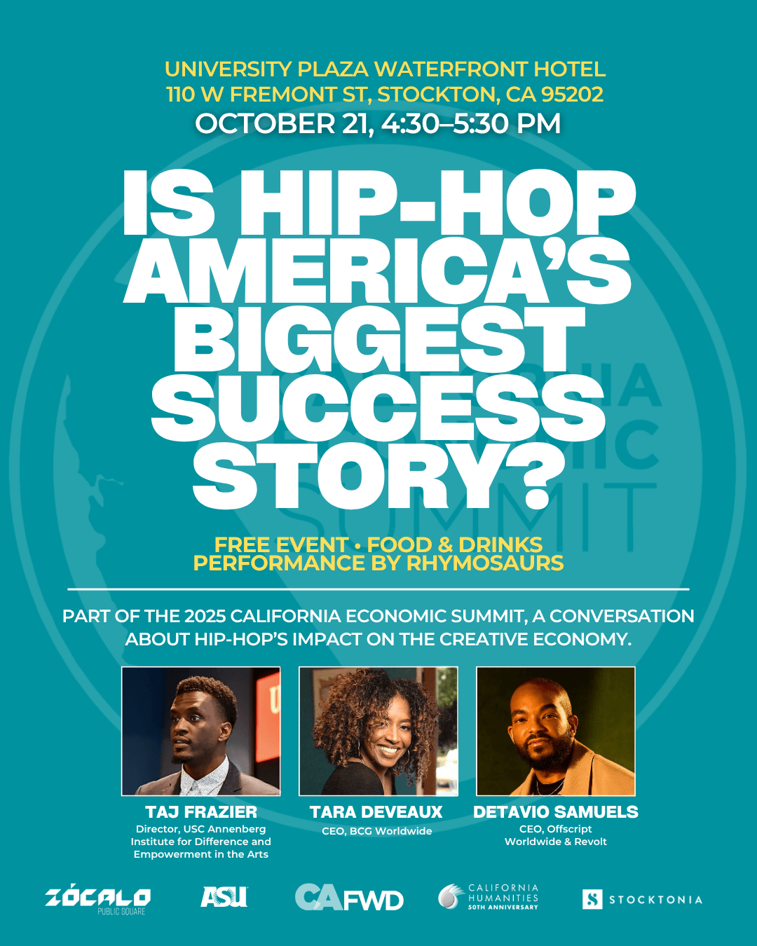 Hip-hop is big business—venturing from the world’s grandest and most expensive stages into lucrative sponsorships in sneakers and apparel, nightlife and liquor, real estate and sports. The industry has gone from “main street” to mogul, turning Dr. Dre’s beats into a lucrative headphone brand and transforming an artist like Jay-Z from a “businessman” to a “business, man.” Is hip-hop the driving force behind Black business and economic mobility? What can we glean from its innovative strategies and enterprising spirit? And how do the creative economies hip-hop has brokered affect California’s racially diverse and rapidly changing communities?