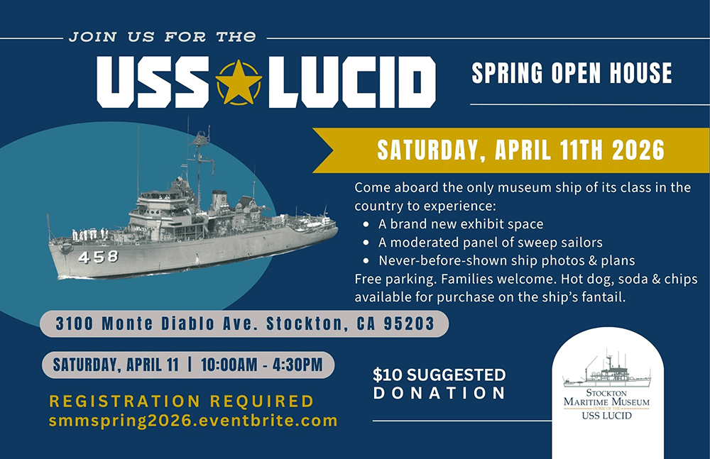 Join us Saturday, April 11, 2026 from 10 AM to 4:30 PM for a guided tour of the USS Lucid, a US Navy ship berthed right here in Stockton! Enjoy a moderated Q&A panel with real life sweep sailors and a revamped exhibit space with never-before-shared photos of Lucid at her builder's shipyard in Louisiana, information on minesweeper construction techniques, minesweeper ships plans, Lucid muster rolls, and more! Ship berthed at 3100 Monte Diablo Avenue, Stockton CA 95203 across from Louis Park. Family Friendly. Free parking. Suggested donation of $10 per adult & $5 per child. Hosted by the Stockton Maritime Museum. RSVP required: smmspring2026.eventbrite.com